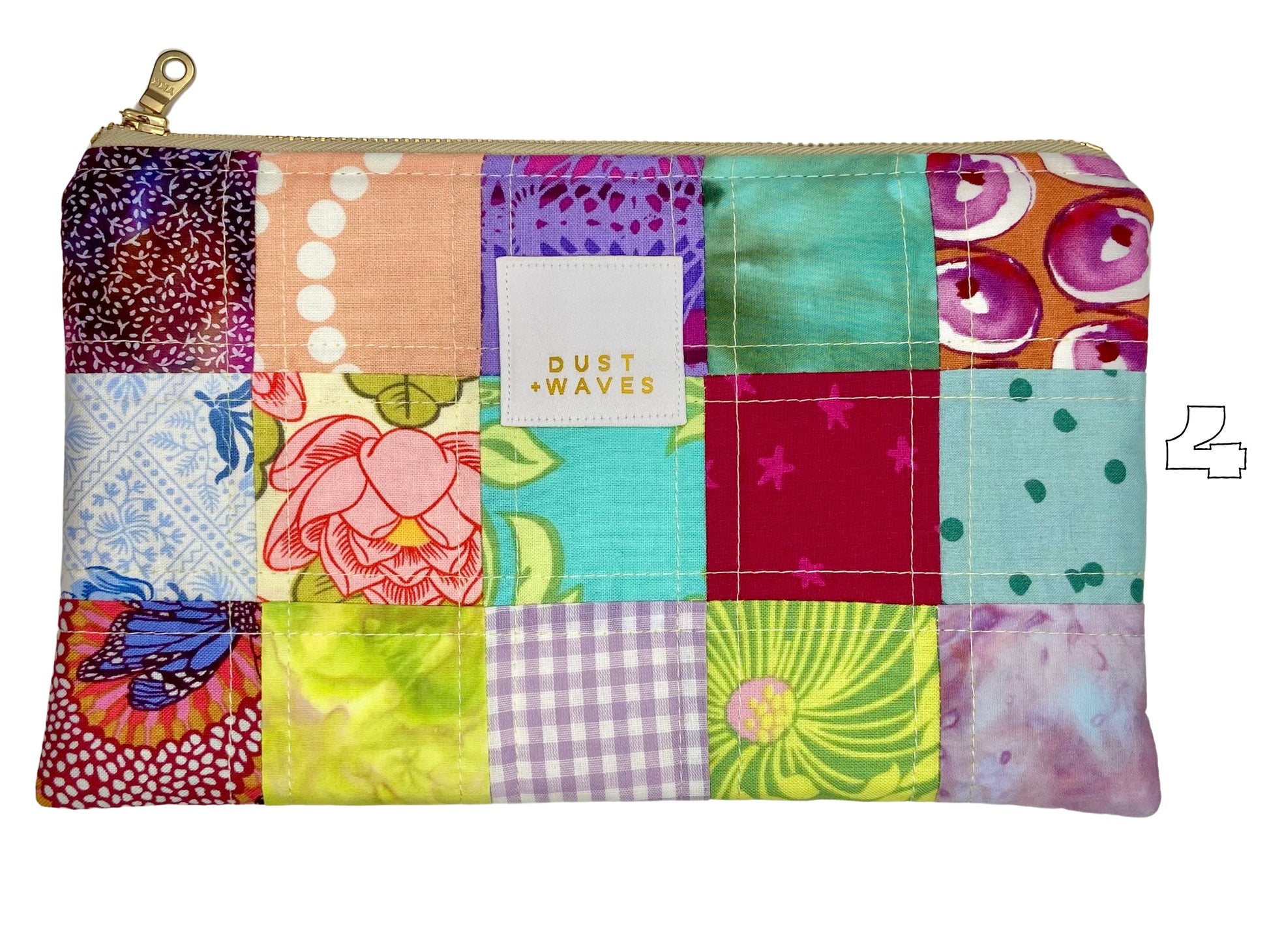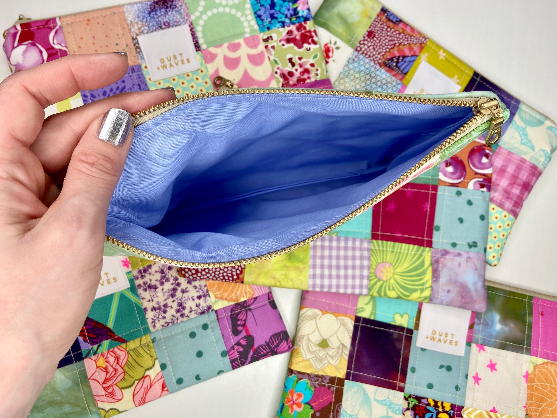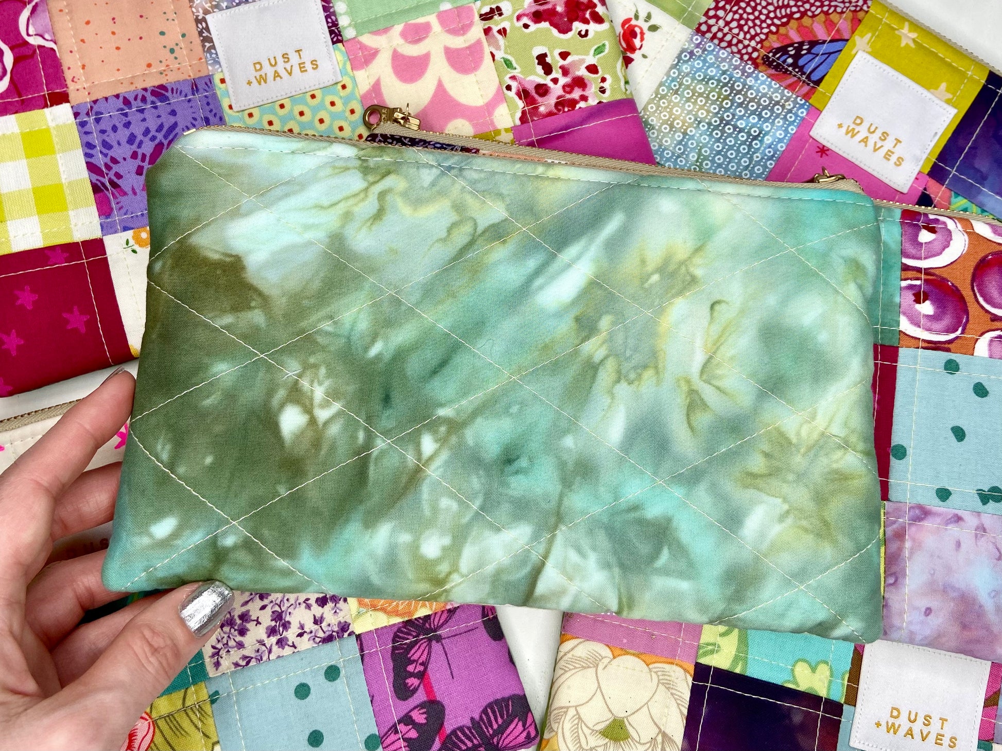 These zip purses measure 5x10". They have been made using leftover quilt pieces from this season's Ombre Checkerboard quilt - a mix of my hand dyes and designer prints. Each features my Jadeite fabric colorway on the back. Quilted using 80/20 cotton/poly batting, fully lined with a periwinkle Kona cotton solid, and features a gold metal zipper.