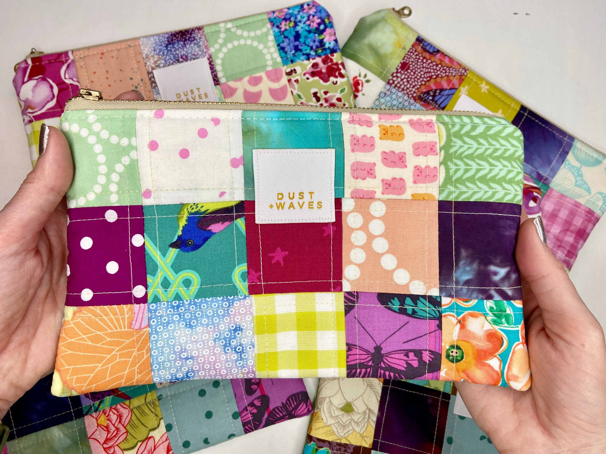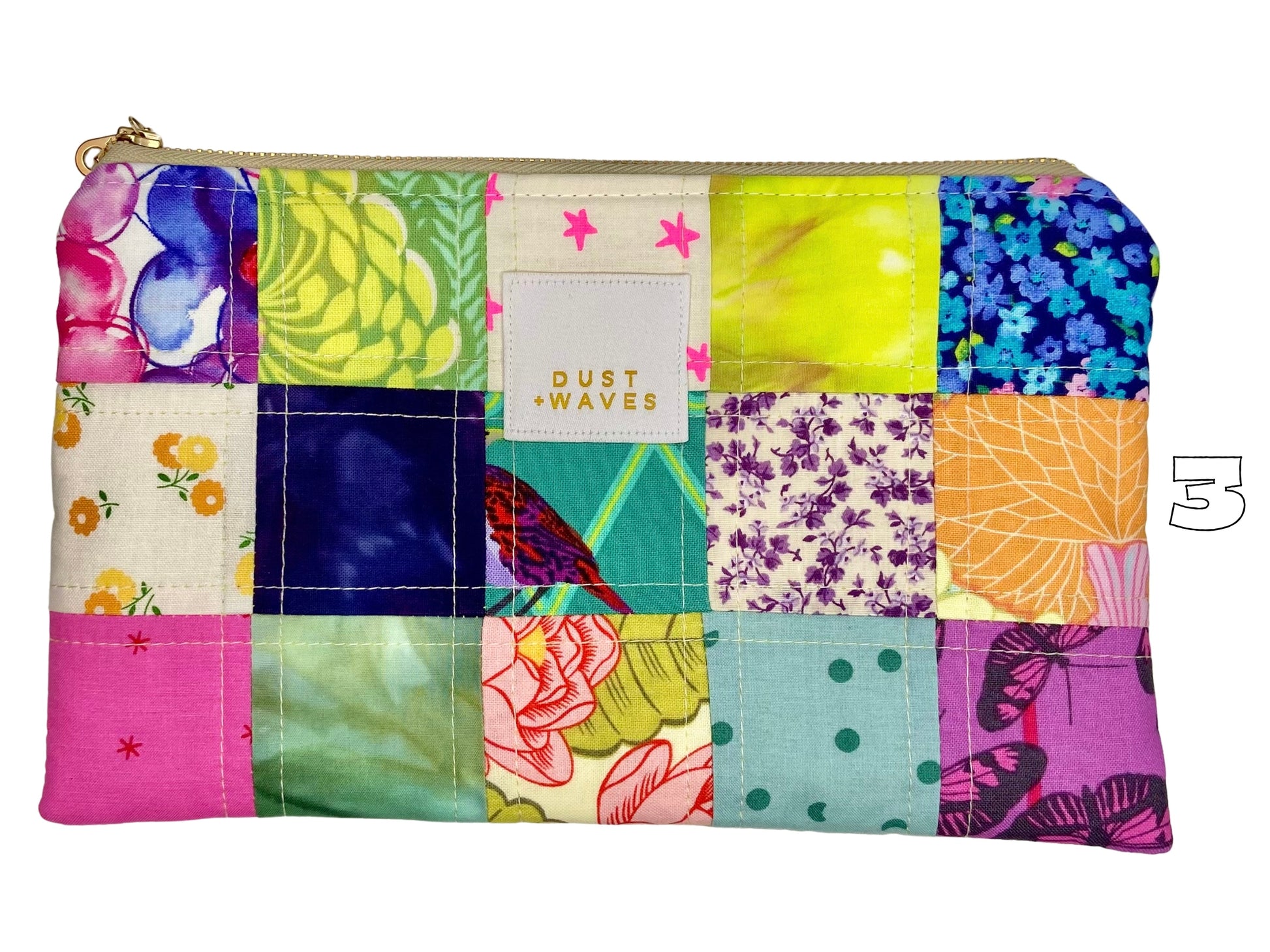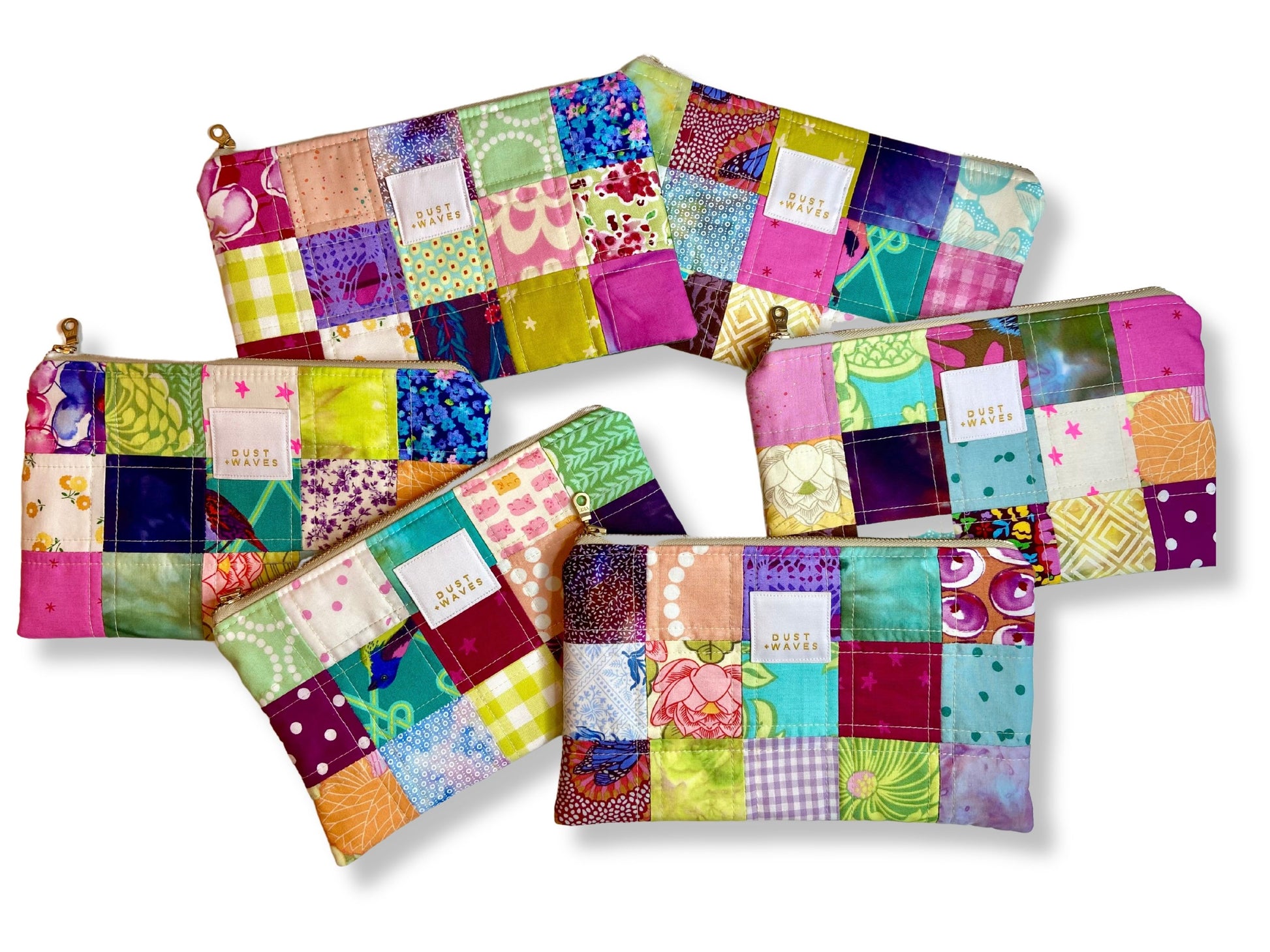 These zip purses measure 5x10". They have been made using leftover quilt pieces from this season's Ombre Checkerboard quilt - a mix of my hand dyes and designer prints. Each features my Jadeite fabric colorway on the back. Quilted using 80/20 cotton/poly batting, fully lined with a periwinkle Kona cotton solid, and features a gold metal zipper.