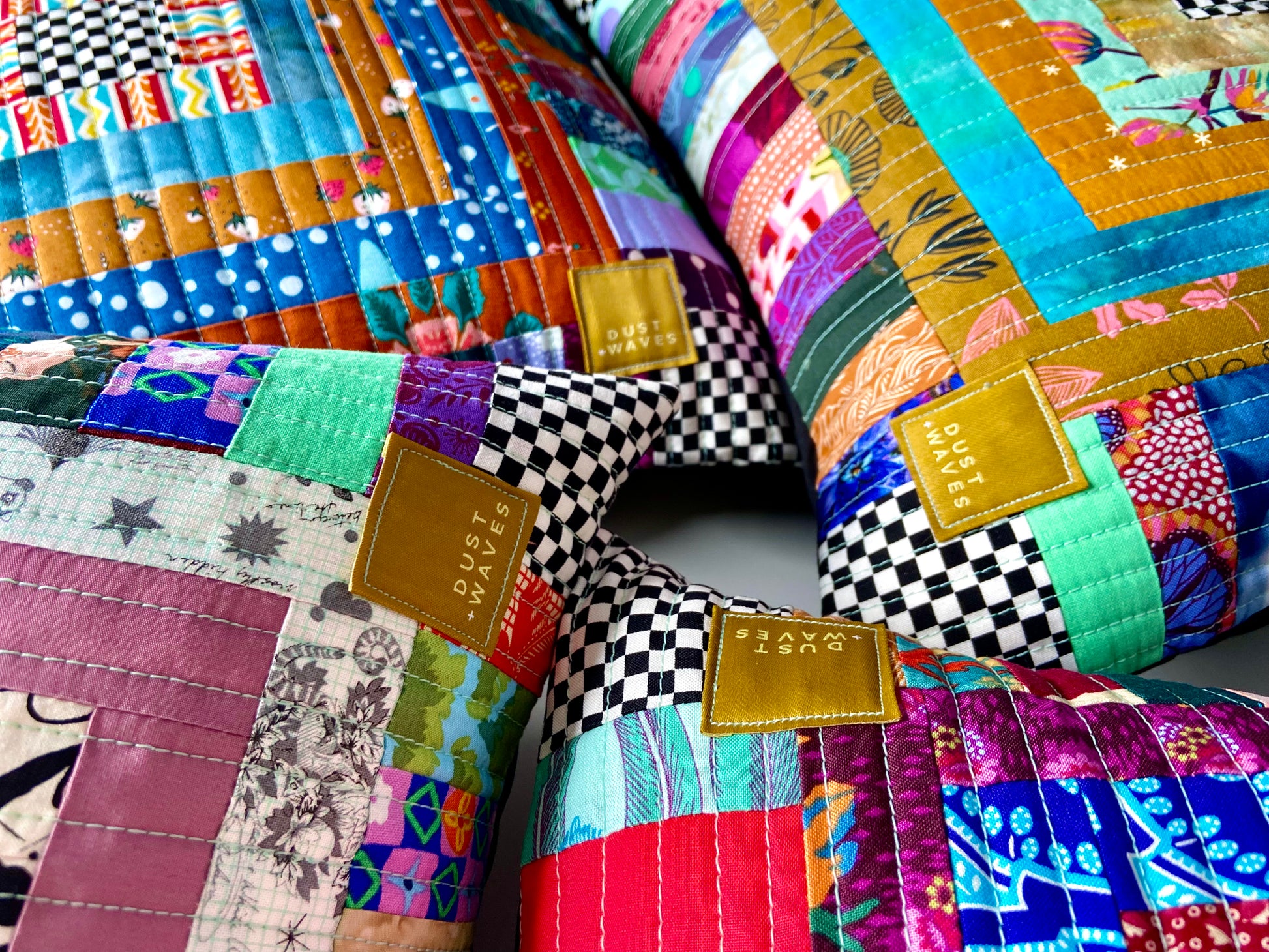 These pillow covers fit on 18" pillow forms (not included). Coordinates with the Out of the Box quilt, made almost entirely with scraps from leftover projects, fully lined, 80/20 cotton/poly batting, and quilted with aqua thread. Envelope back made with black Kona cotton, easy off and on.
