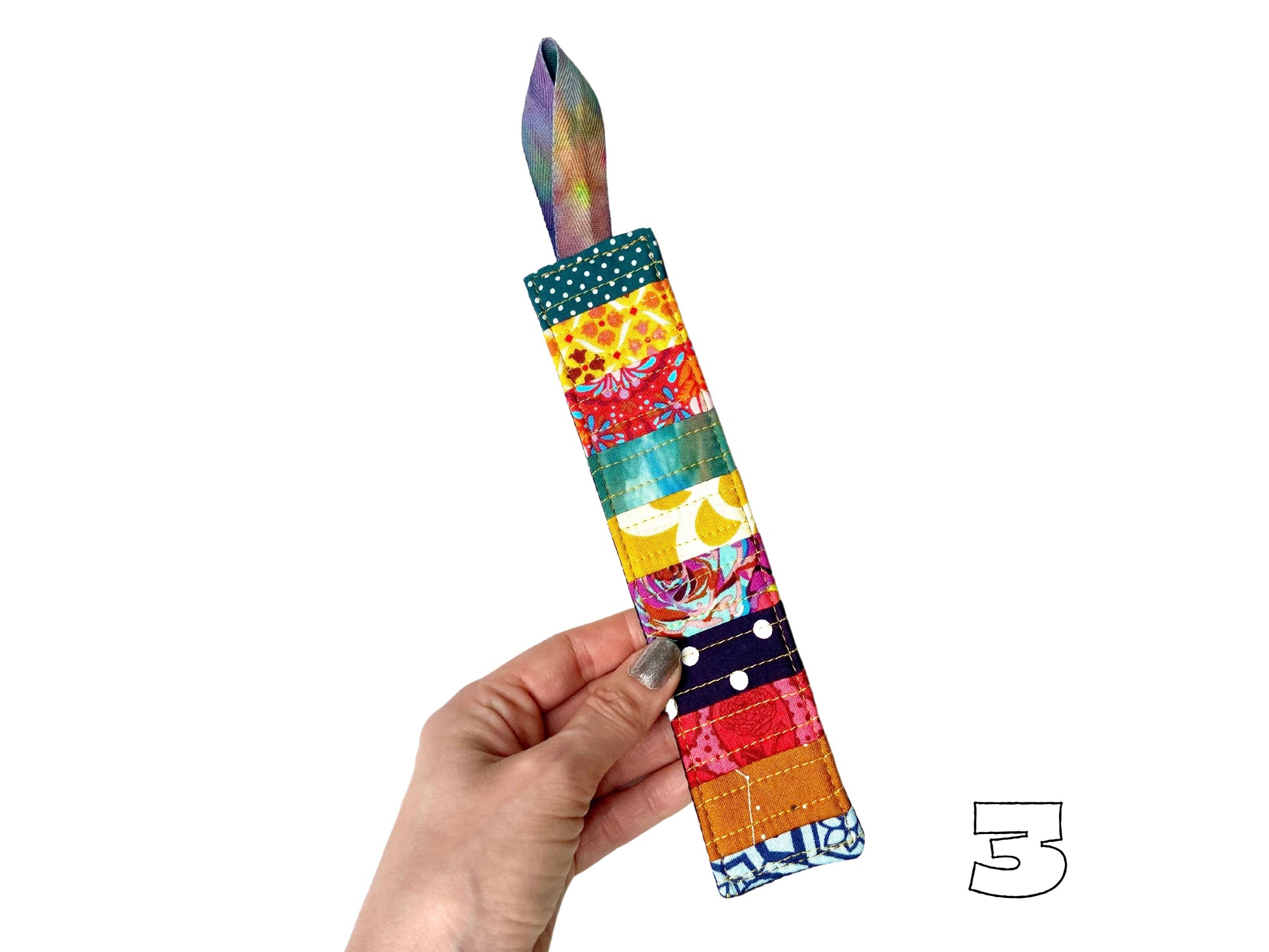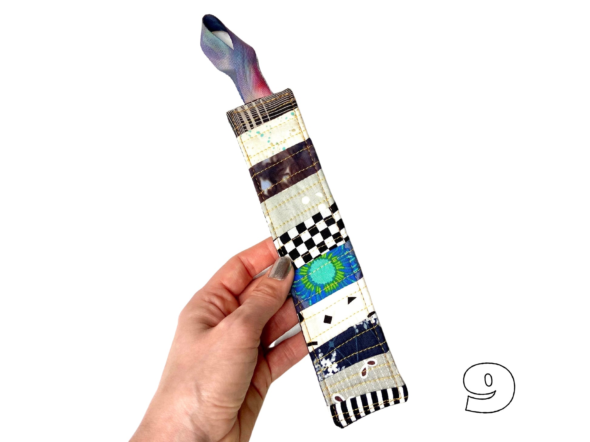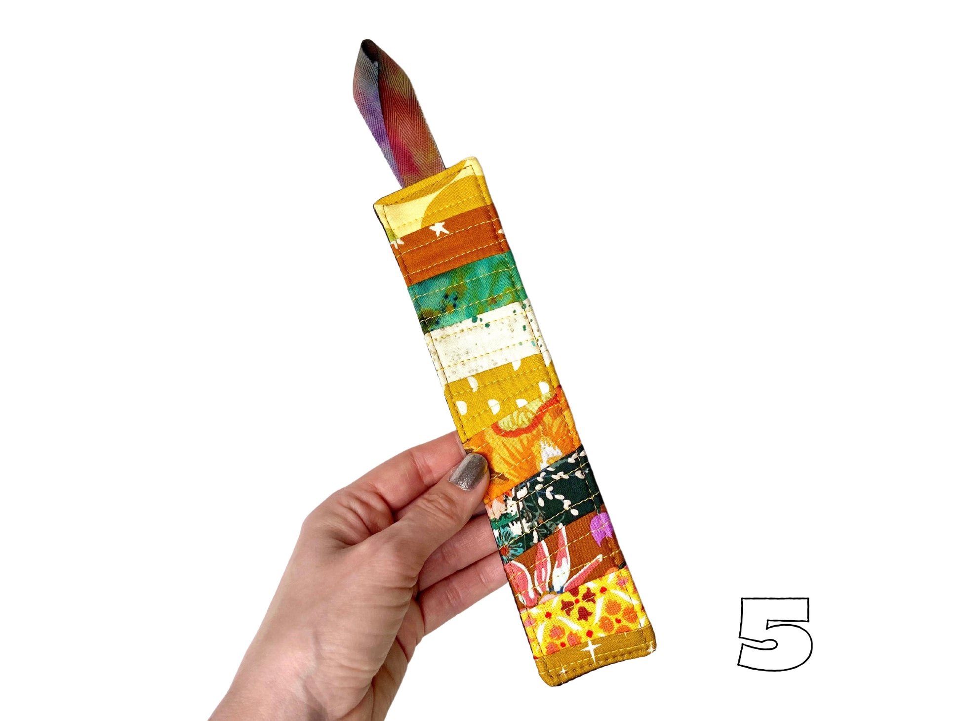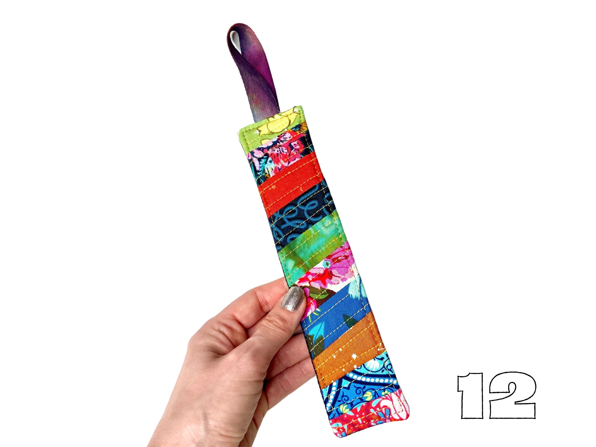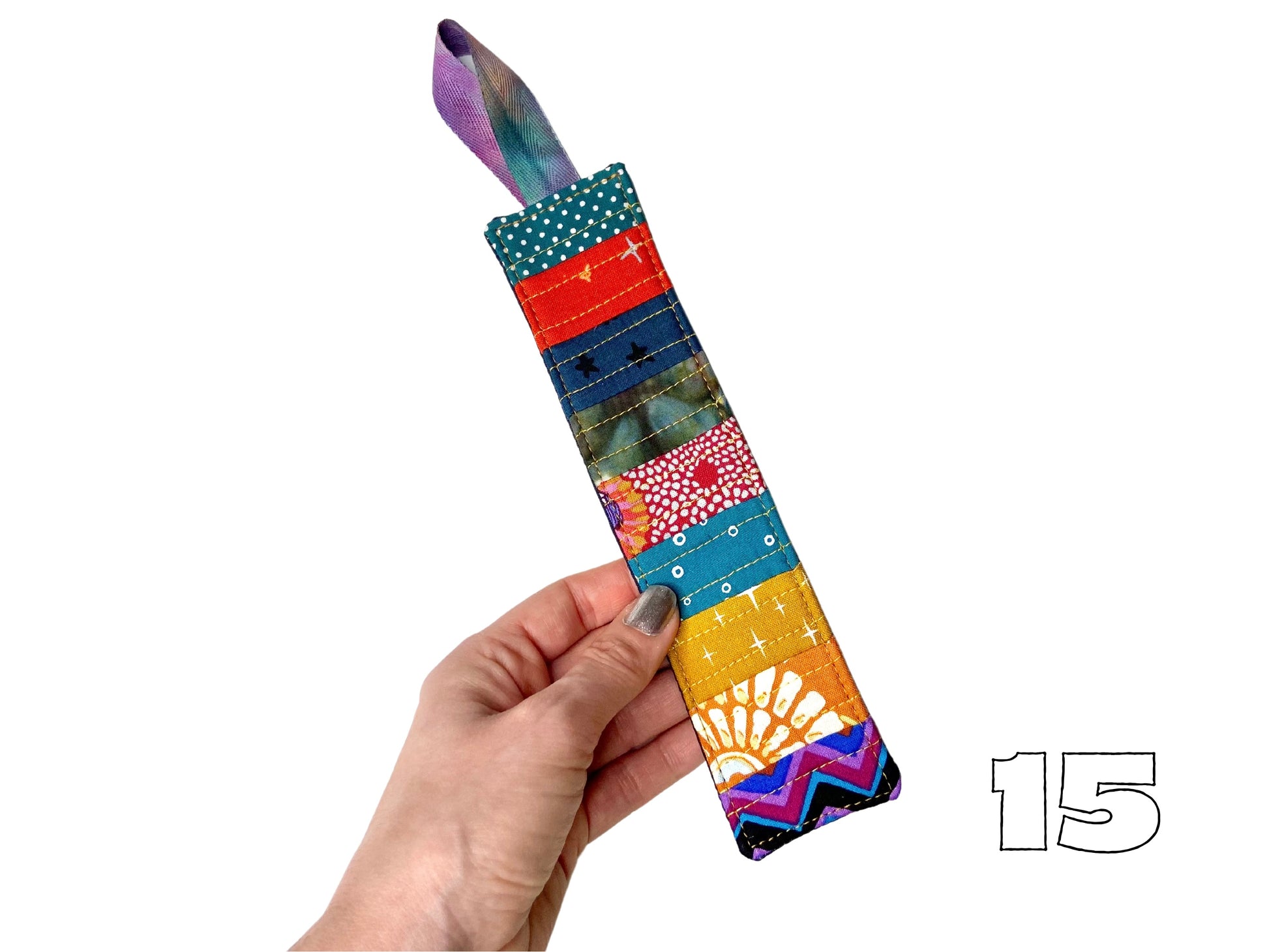 These patchwork quilted bookmarks measure 2"x9.5" and are perfect for any book worm! They have been made from quilt scraps leftover from this season's quilts, are lined inside with felt to ensure they are both strong and soft, and are adorned with an ice dyed cotton ribbon at the top. They are backed with a charcoal black solid cotton. Please see photos for size scale with both a hardcover and paperback book.