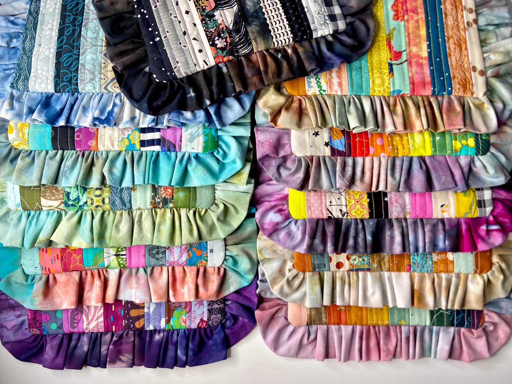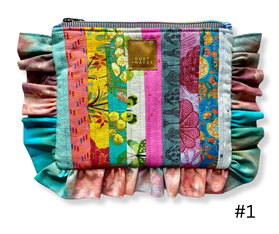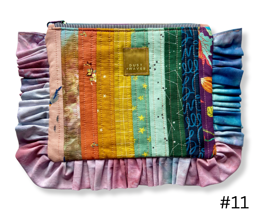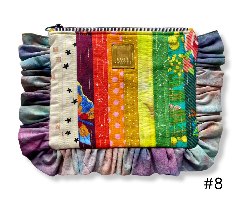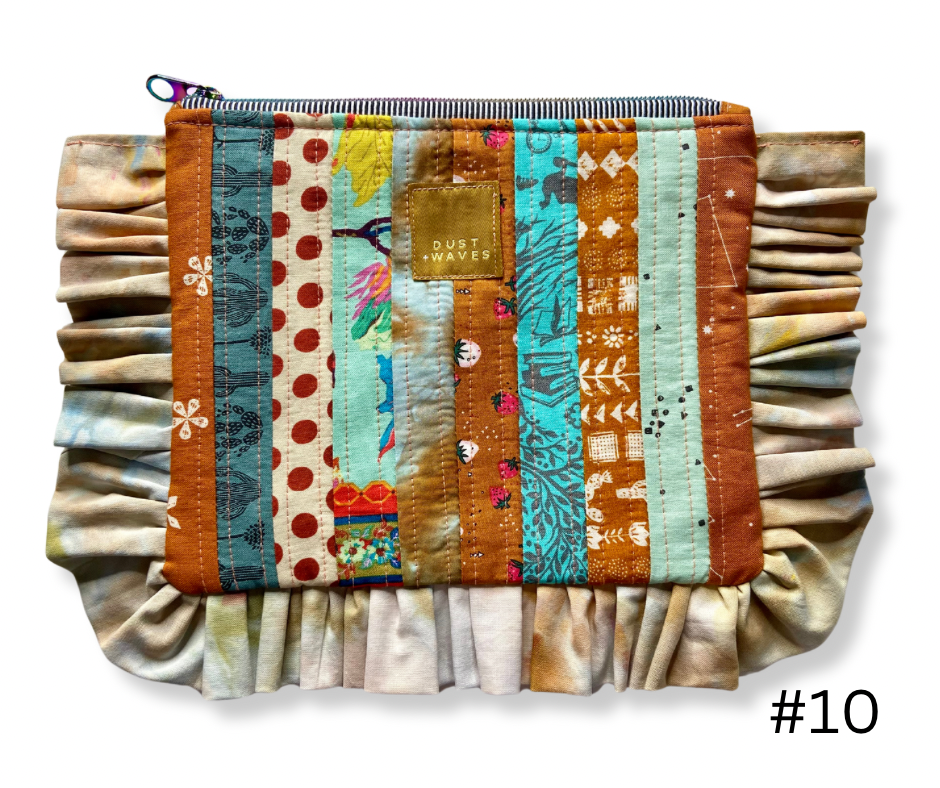 You may choose the exact bag you want by clicking on the corresponding numbers. These ruffled zip purses were made using leftover scraps from my scrap bins, plus my dyed fabrics for the ruffles! Each one is nearly the same quilted scrappy fabrics front and back. The lining inside of each is a fucshia Kona cotton. Each has a rainbow zipper. These bags measure 8"x9" with 1.5" ruffles.